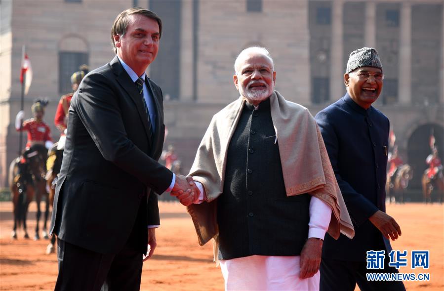 1月25日,印度總統科溫德(右)與印度總理莫迪(中)在首都新德里歡迎巴西總統博索納羅。新華社發(帕塔·薩卡爾攝)