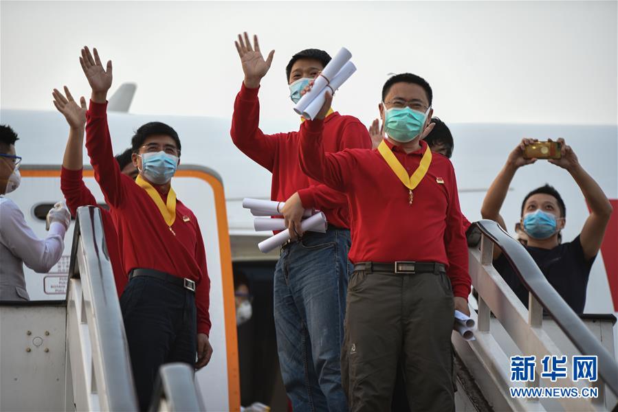4月11日,在委內瑞拉首都加拉加斯,中國抗疫醫療專家組在授勛儀式結束后登機回國。 新華社發(薩爾戈多攝)