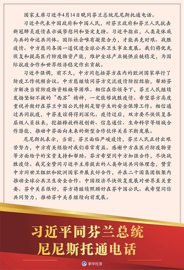 習近平代表中國政府和中國人民,對芬蘭政府和芬蘭人民抗擊新冠肺炎疫情表示誠摯慰問和堅定支持。習近平指出,人類是休戚與共的命運共同體。國際社會唯有凝聚合力,才能共克時艱、戰勝疫情。中方愿同各國一道促進全球公共衛生事業發展。我們將優先恢復和提高醫療防疫物資產能,維護全球產業鏈供應鏈穩定,為國際抗疫合作和世界經濟穩定作出貢獻。