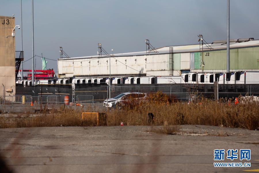 12月3日,在美國紐約,存放新冠病亡者尸體的冷藏車停放在一處臨時停尸場內。