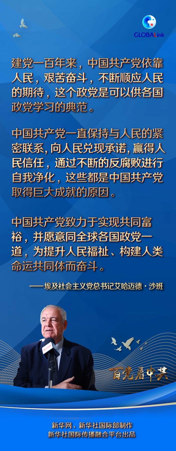 新華社開羅4月2日電 “建黨一百年來,中國共產黨依靠人民,艱苦奮斗,不斷順應人民的期待,這個政黨是可以供各國政黨學習的典范?!卑<吧鐣髁x黨總書記艾哈邁德·沙班日前在位于開羅的該黨總部接受新華社記者專訪時如是說。