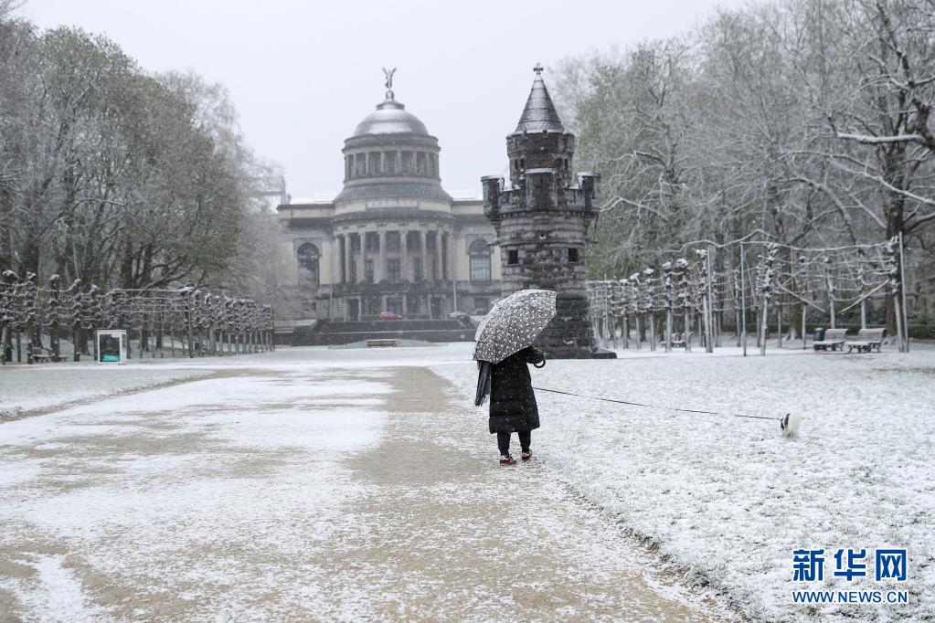 4月6日,一名市民在比利時布魯塞爾五十周年紀念公園冒雪遛狗。