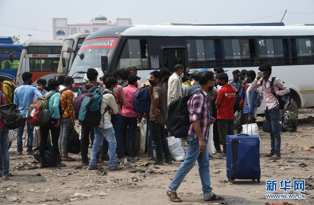 5月5日,印度比哈爾邦宣布實施封鎖措施后,人們在印度巴特那汽車站準備乘坐巴士返回家鄉。