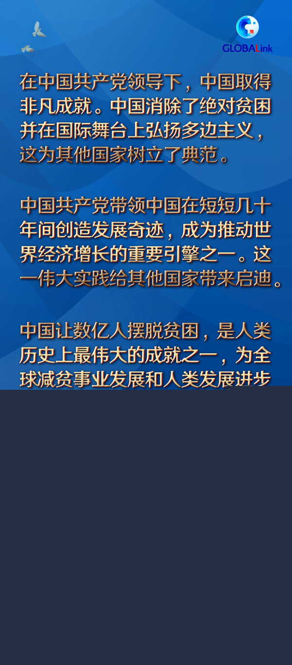 “新中國成立之時,中國還很貧窮。中國共產黨帶領中國在短短幾十年間創造發展奇跡,成為推動世界經濟增長的重要引擎之一。這一偉大實踐給其他國家帶來啟迪?!?/p>